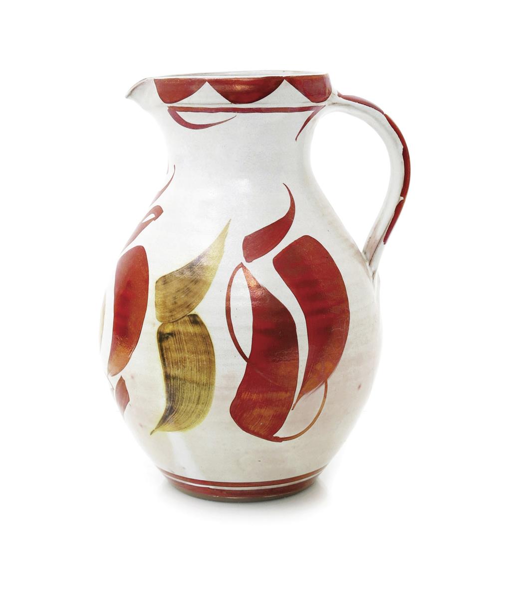 an Aldermaston Pottery jug, dated 1987, probably thrown by Juliet Wilson, bellied form covered in a tin-glaze, painted with simple ruby and ochre brush-strokes, painted marks to base, painted date code for 1987, 25.5cm. high