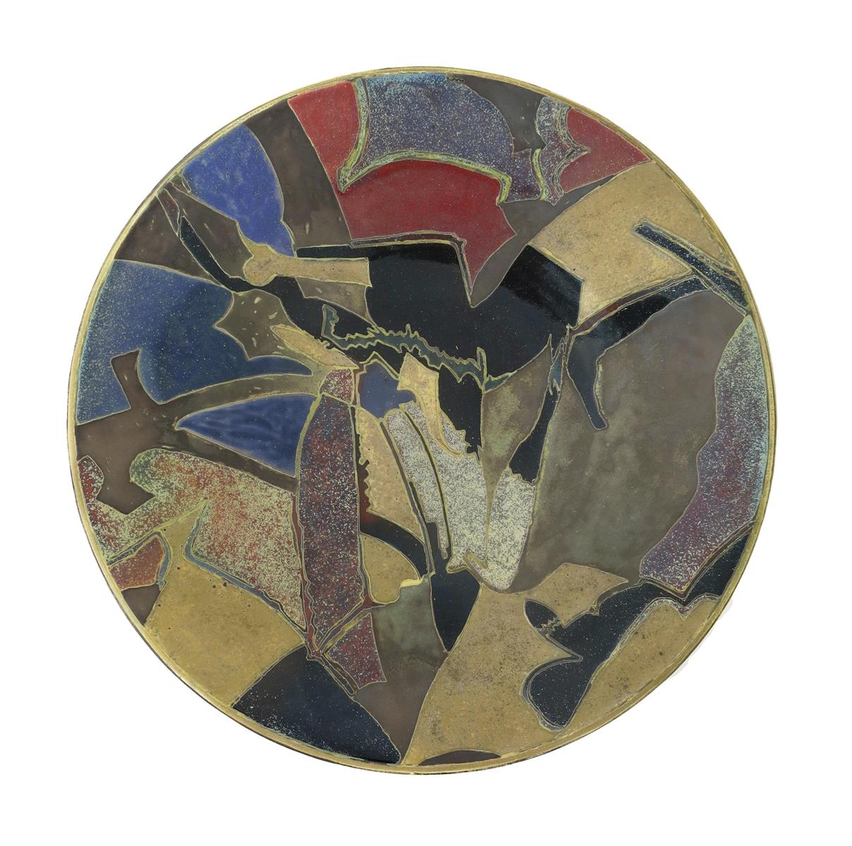 a large flaring earthenware bowl, on narrow foot, painted with geometric design in blue, red, and golden lustre impressed seal to foot rim, paper label number 44, 46.5cm. diam.