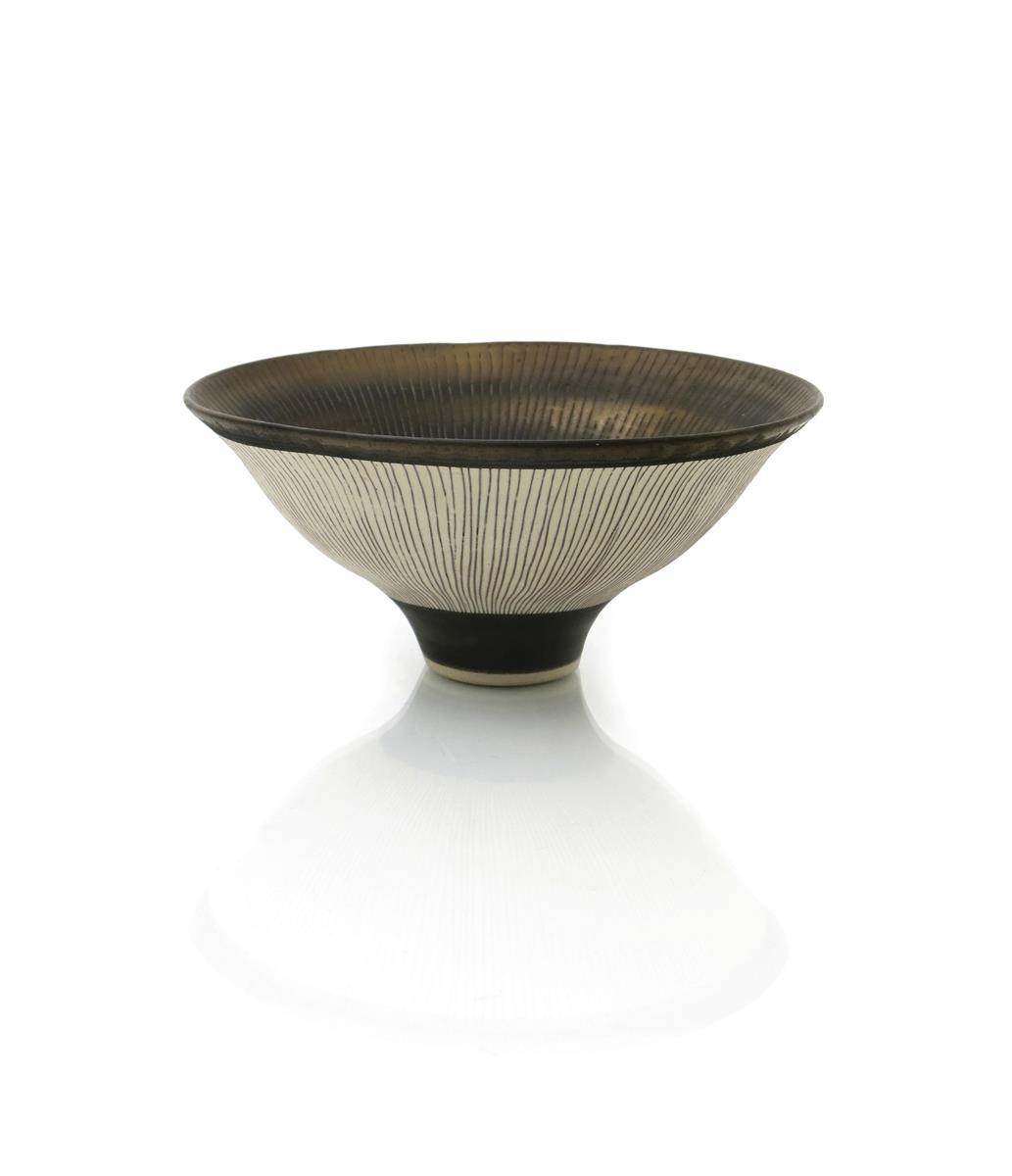a fine porcelain footed bowl, the interior covered in a golden bronze glaze with radiating sgraffito lines, the exterior matt white with incised and inlaid manganese lines between bronze band on outer rim and foot, impressed seal mark, 8.5cm. high, 19.5cm. diam.