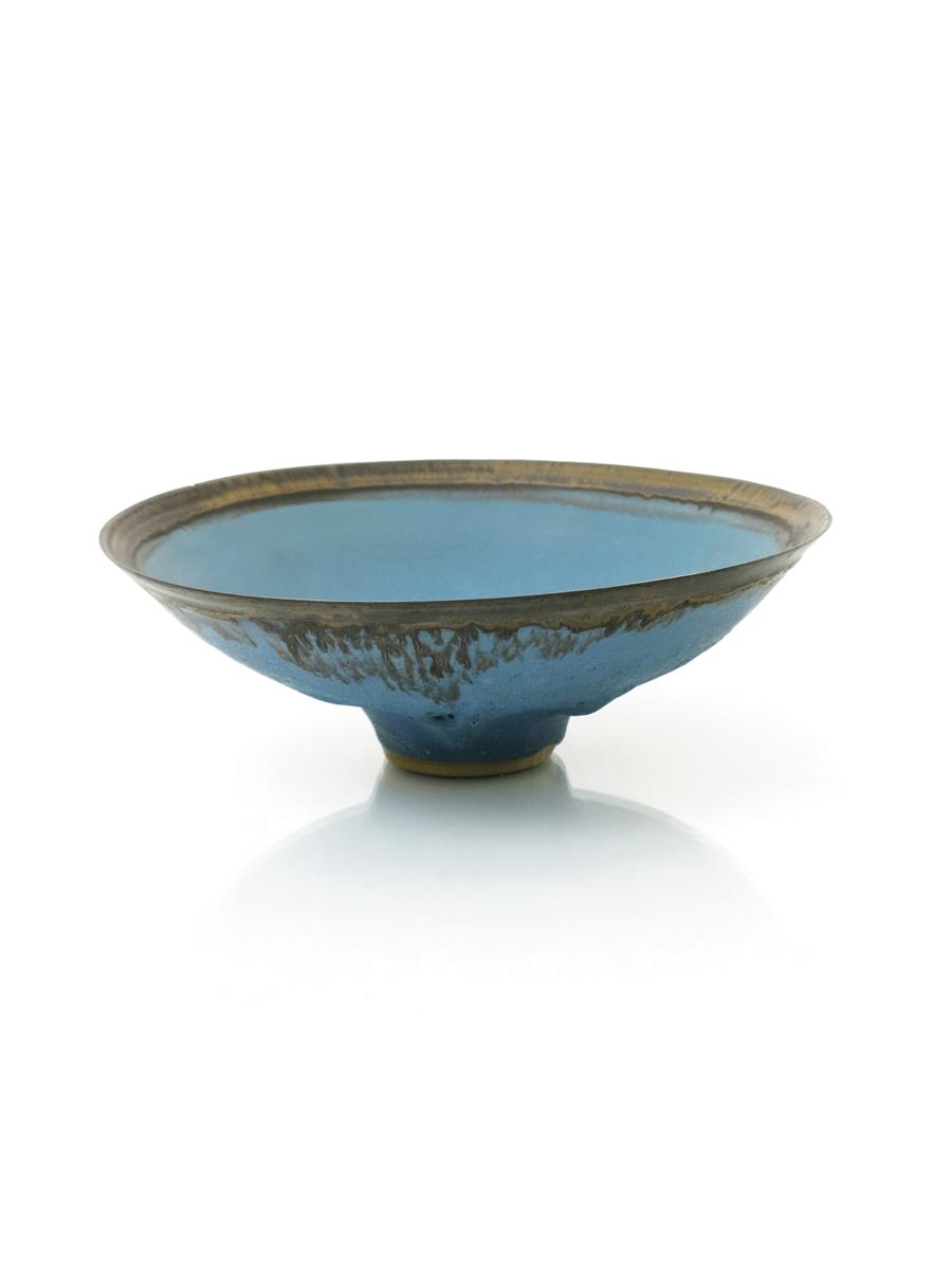 a porcelain footed bowl, low, flaring form, covered in a turquoise blue glaze to the foot with volcanic running patches, with bronze rim, impressed seal mark, small nick to bronze rim, 22cm. diam.