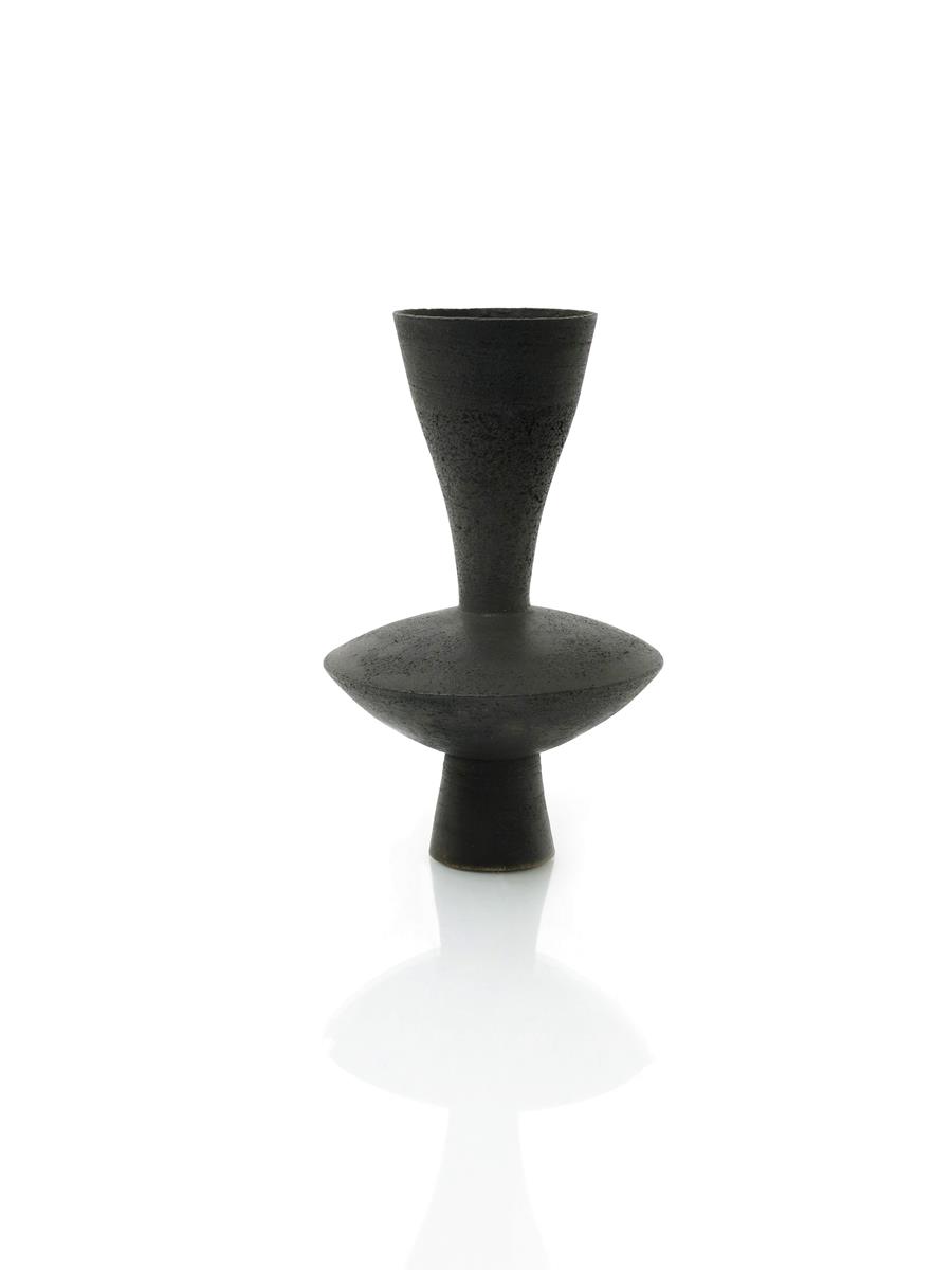 a Digswell stoneware composite vase, tapering foot supporting swollen disc body and flaring neck, covered in a black matt glaze, impressed seal mark, small frit to top rim, 22.5cm. high