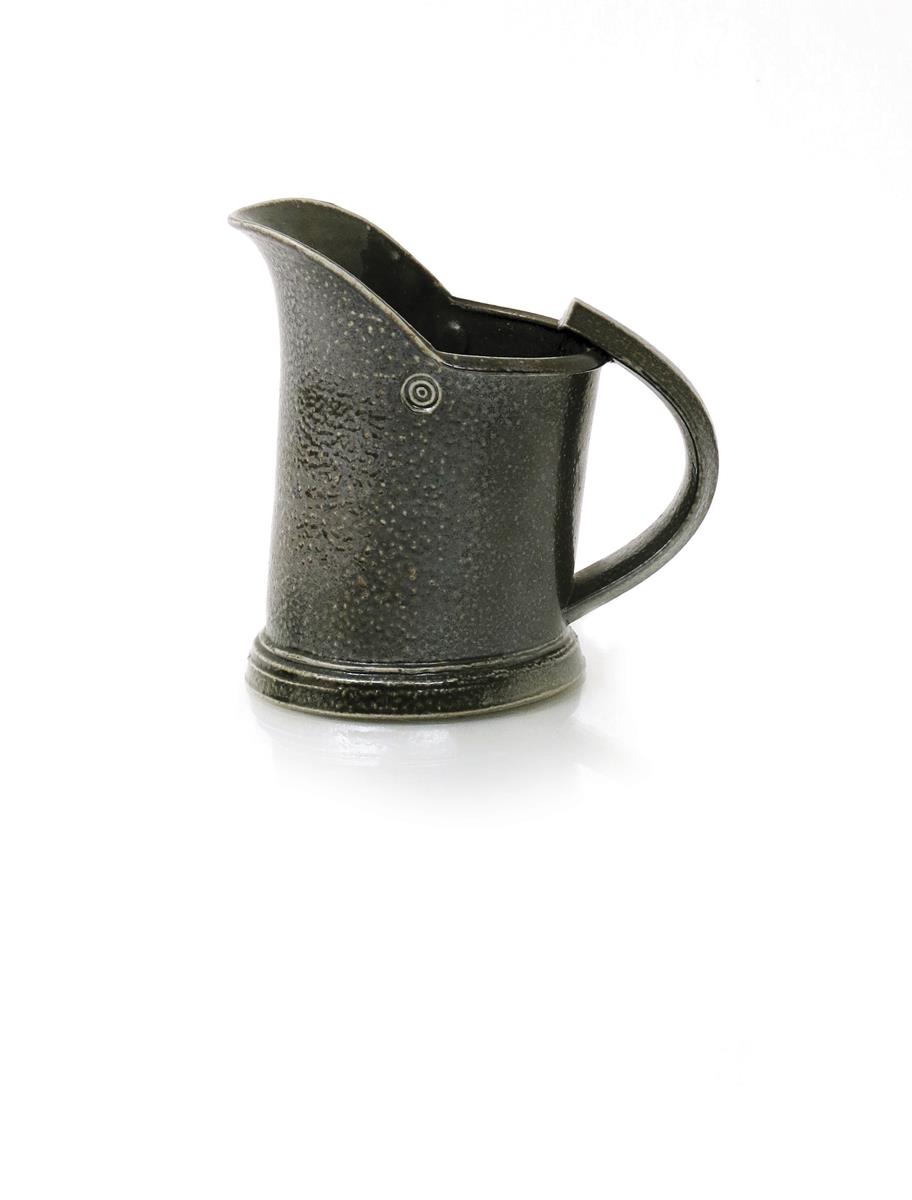 a salt-glazed stoneware jug, angled cylindrical form with applied strap handle, covered in a textured blue-grey glaze, impressed seal mark to side, 12cm. high