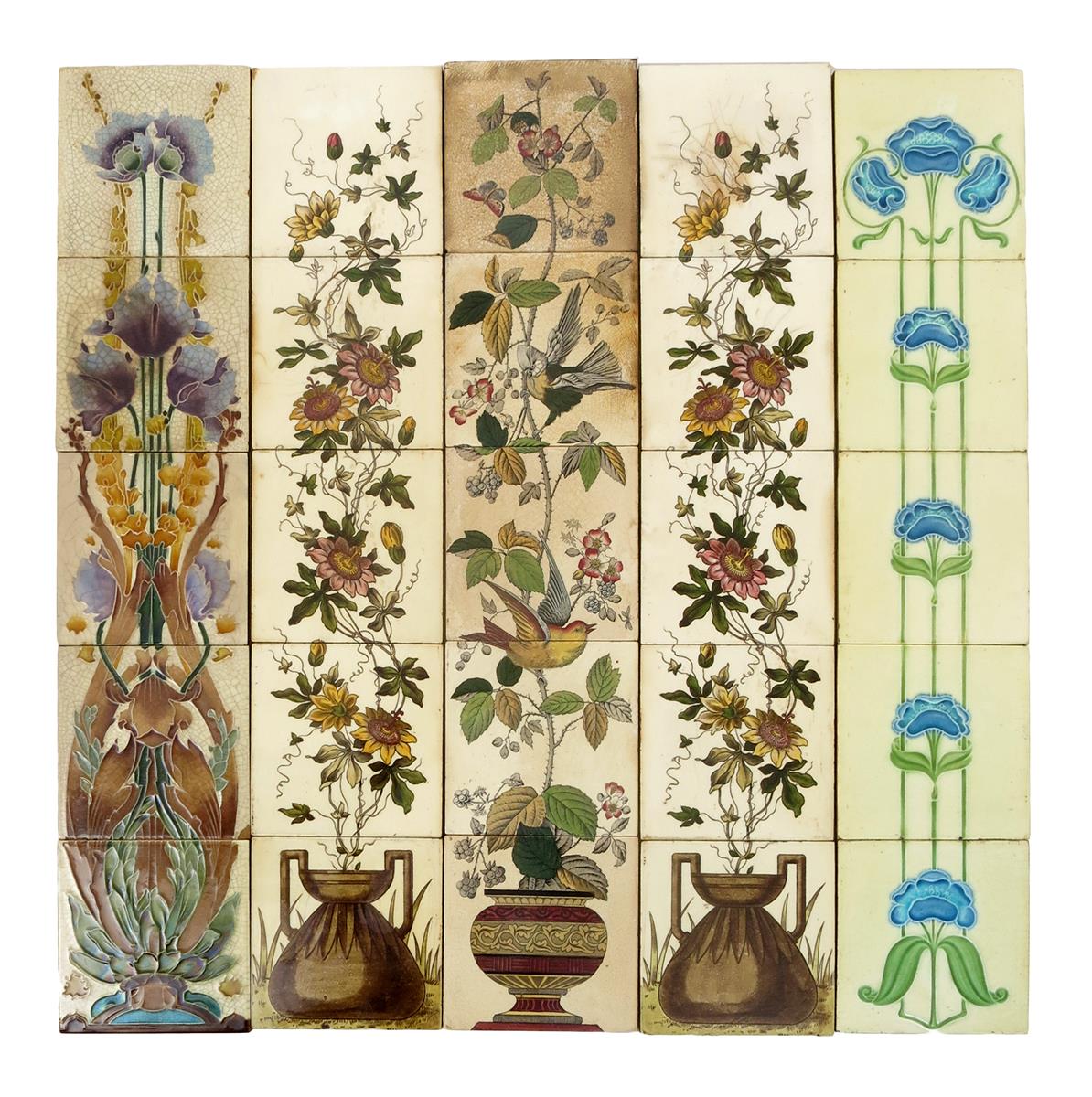 A pair of Aesthetic Movement five tile panels probably Minton's, each printed and painted with a passion-flower stem in a vase, in colours on a cream ground and another J & W Wade five tile panel decorated with finches perched on a blackberry stem, mounted on wood, and two dust-pressed Art Nouveau tile panels similar, marks concealed, 76 x 15.5cm. (5)