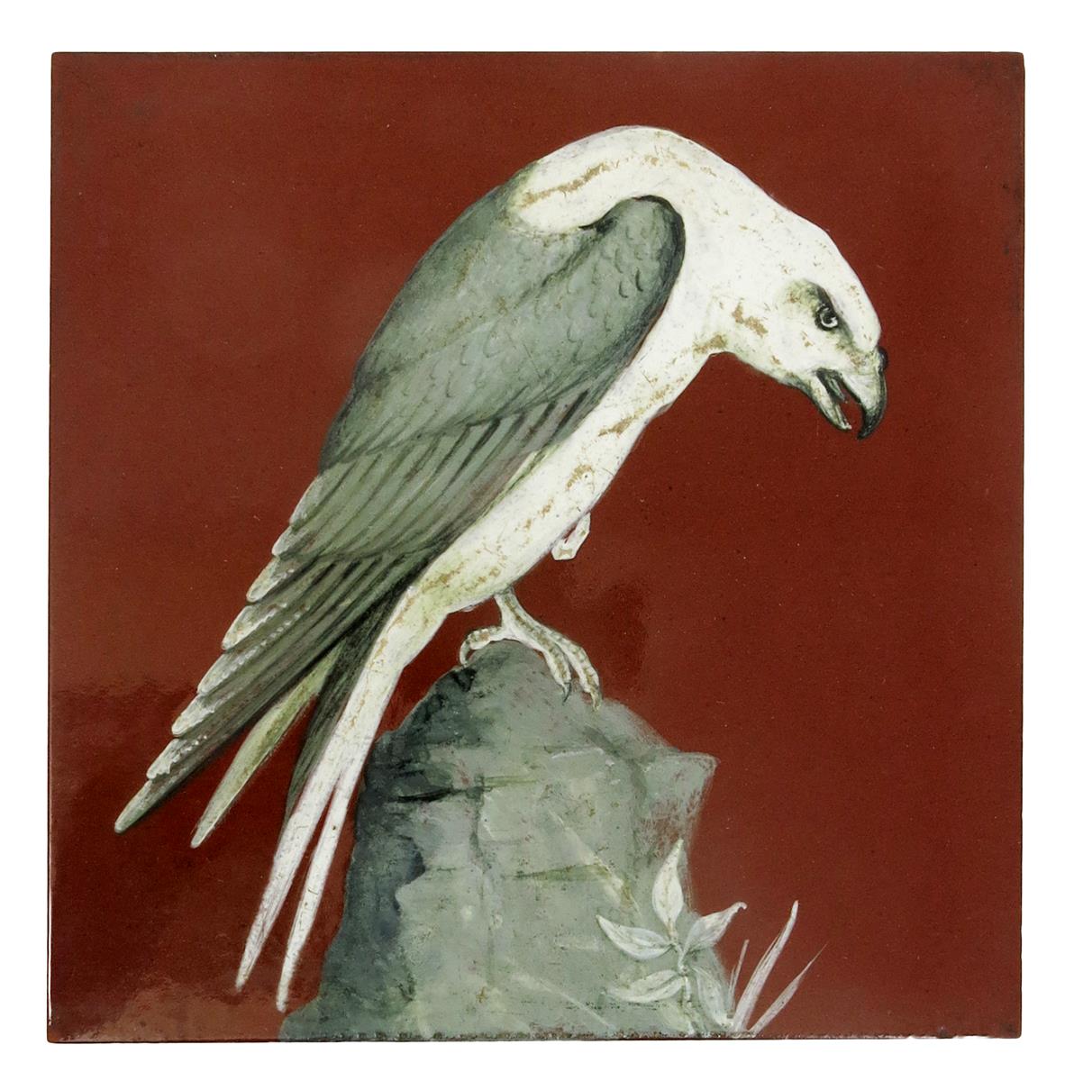 A large Minton's Art Pottery Studio tile, painted with a white falcon, resting on a rock outcrop, impressed and printed marks, 21cm. square