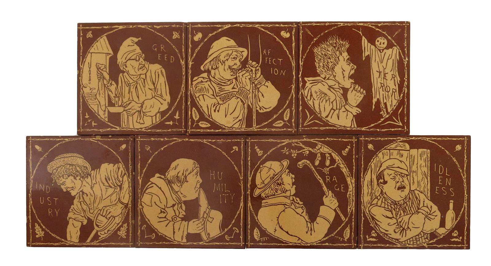 A set of seven Minton Rustic Humours tiles, printed in brown and buff, comprising Terror, Humility, Greed, Rage, Industry, Idleness and Affection, impressed marks, 15.5cm. square (7)