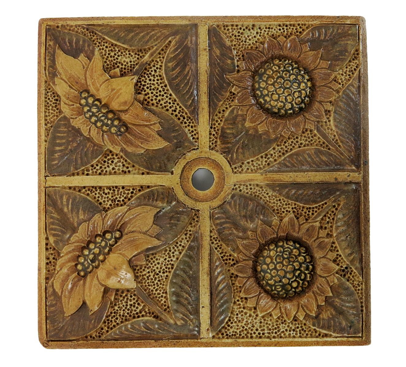 A Martin Brothers stoneware tile, moulded in low relief with panels of sunflowers, in brown and green on a buff ground, unsigned, 18cm. square