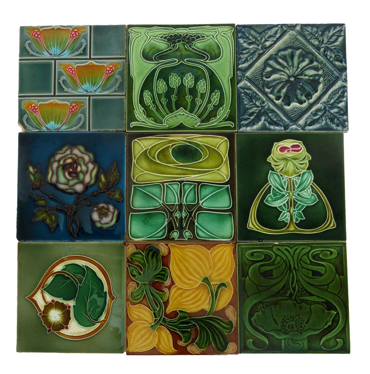A Pilkington's Lancastrian tile designed by Lewis F Day, dust-pressed with a stylised flower and foliage, glazed in shades of yellow, green and mushroom on a brown ground, a Henry Richards Art Nouveau tile and a collection of Art Nouveau floral tiles, unsigned, minor chips, 15.5cm. square (a lot)
