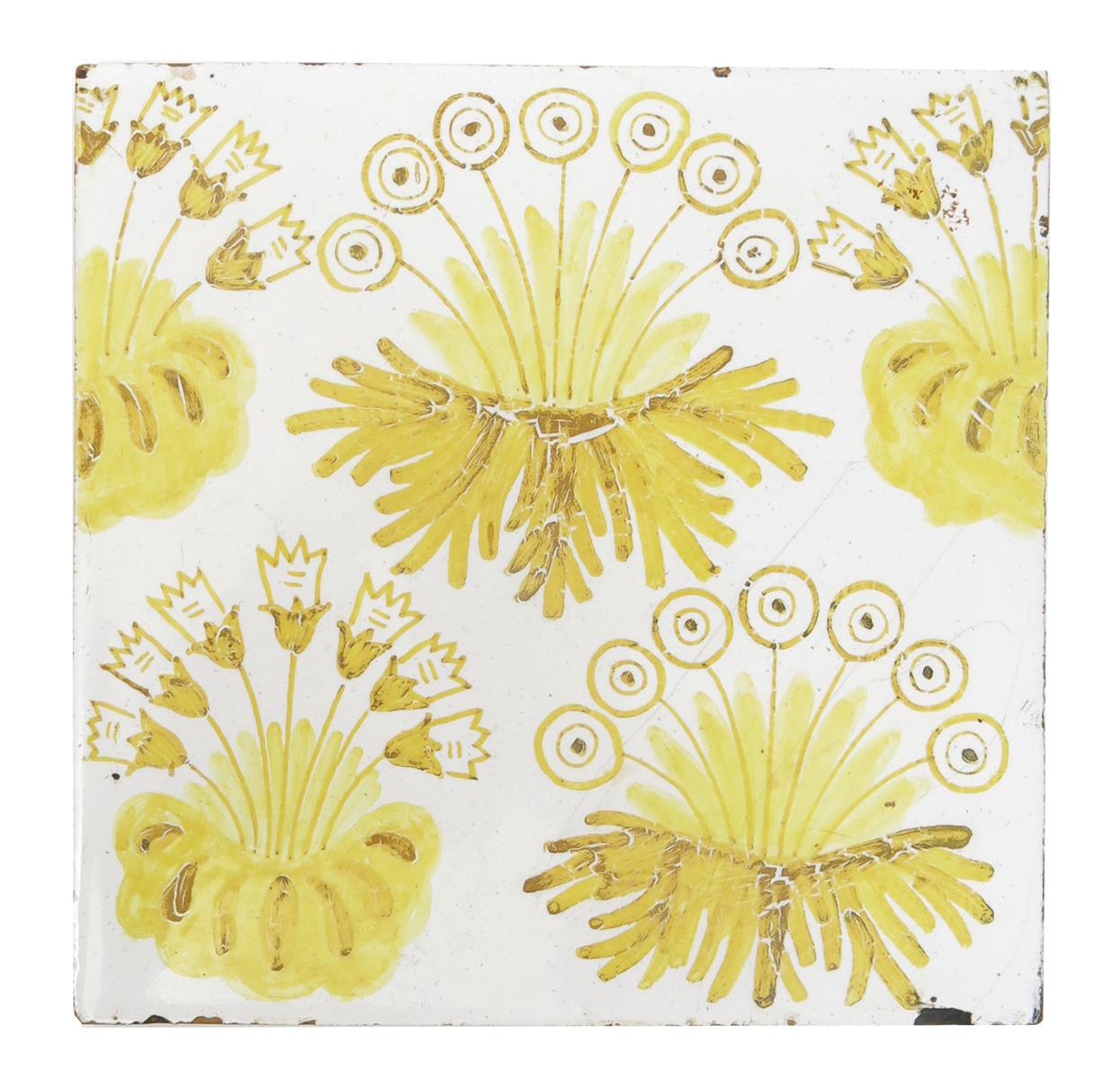 A Morris & Co Daisy tile designed by William Morris, on Dutch Delft blank, painted with clumps of daisy flowers in yellow on a white ground, a Cantagalli Hispano Moresque tile, modelled in low relief with Arabic script, a Thomas Elsley Sunflower tile, a Minton's encaustic tile designed by A.W.N. Pugin and a collection of Art Nouveau tiles, unsigned, minor chips, 15.5cm. square (a lot)
