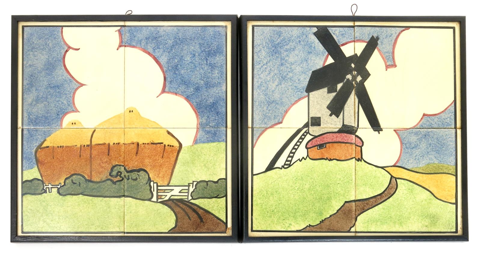 A Carter & Company Poole Pottery Farmyard Series four tile panel designed by E.E. Stickland, made for Dewhurst butchers, hand stencilled with a windmill in a landscape, in colours on a cream ground, framed, and another decorated with two haystacks in a landscape, marks concealed, 32cm. square (2)