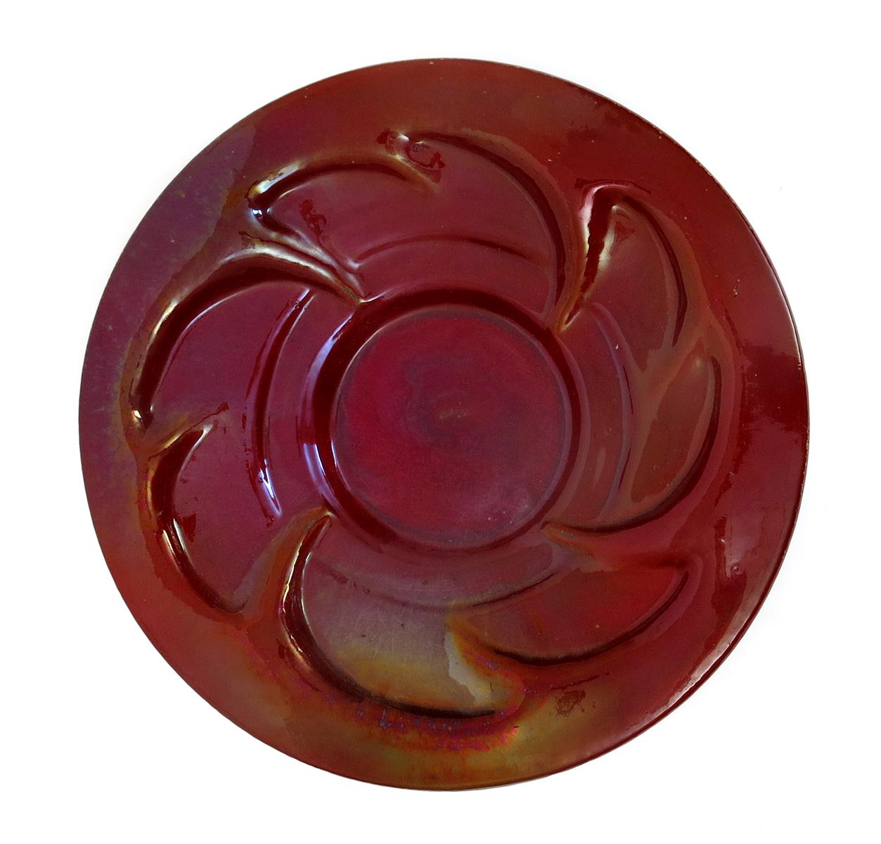 A Carter's Poole Pottery charger designed by Owen Carter, cast in relief and covered in a red lustre glaze incised Carter's Poole 1903, chips to back rim, 46cm. diam.