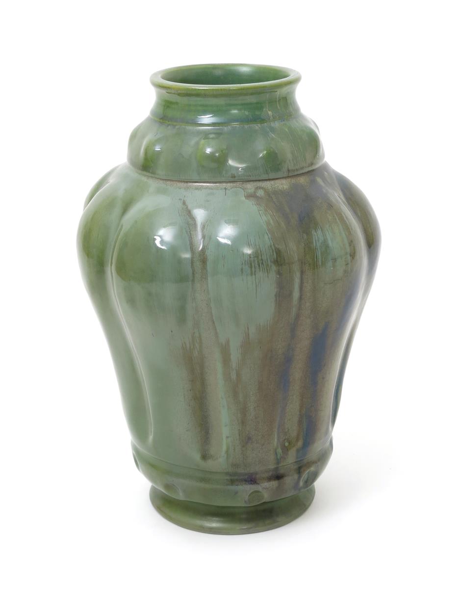 A Carter's Poole Pottery lustre vase designed by Owen Carter, dated 1906, the swollen, gadrooned body with waisted neck, covered in a streaked green lustre glaze incised Carter's 1906, restored, 32cm. high