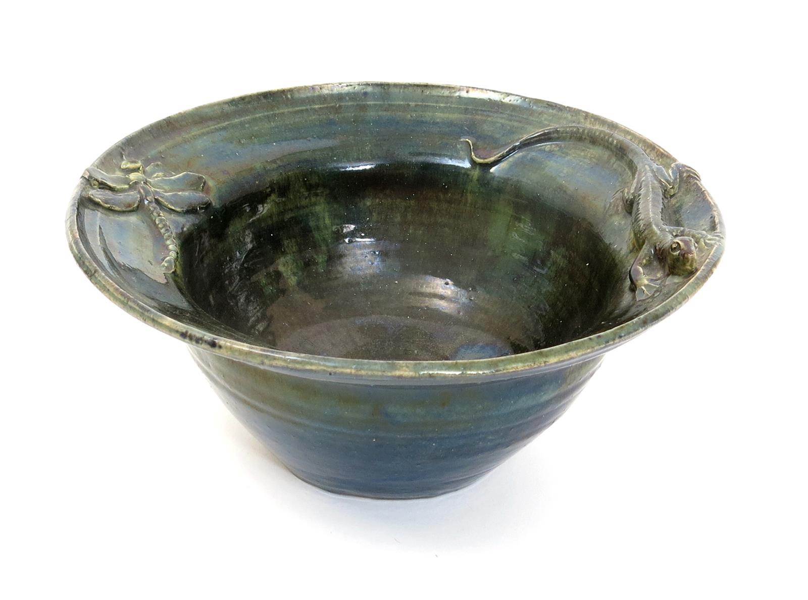 A rare Carter & Company Poole Pottery lustre bowl decorated by Lily Gilham, flaring form, applied to the rim with a dragonfly and a lizard, covered in a green streaked and lustrous glaze, impressed factory mark, 25cm. diam.