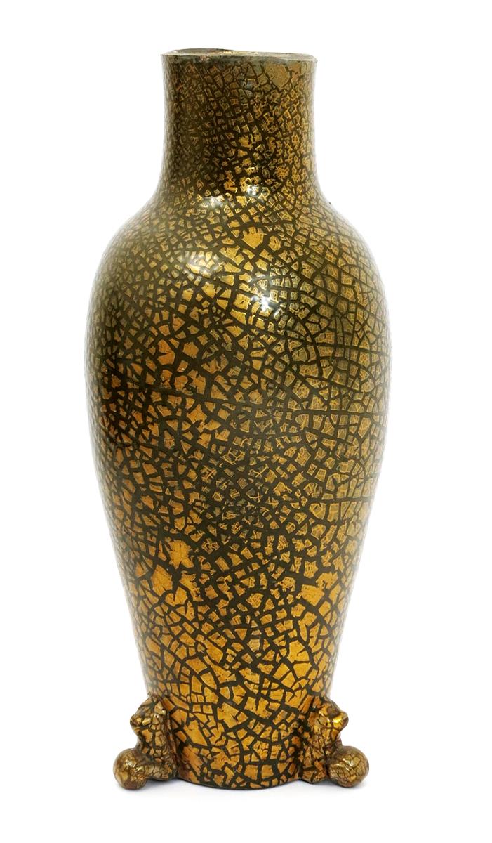 A rare Sunflower Pottery vase by Sir Edmund Elton, shouldered form on three modelled grotesque feet, covered in a crackled golden lustre glaze over olive green painted Elton signature, top rim reduced probably in the pottery, repair to feet, 41cm. high