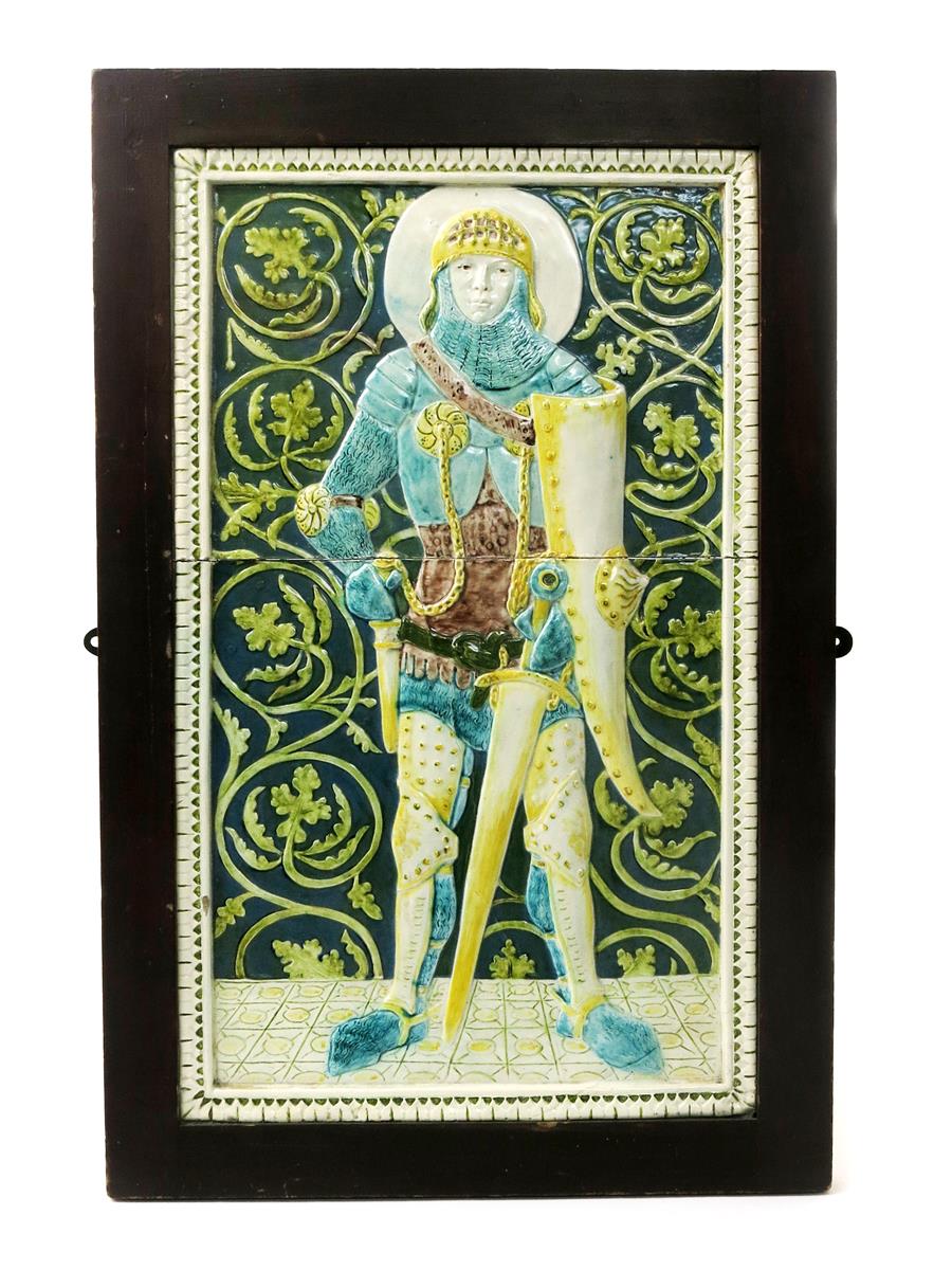 Gideon a fine Della Robbia two-tile panel designed by Ford Madox Brown, by Emily Margaret Wood, possibly dated 1898, modelled in low relief with Saint Gideon in full armour, on a scrolling vine ground, painted in colours, framed incised and painted marks, EMW monogram, incised 3/98, 70 x 42cm. (panel)