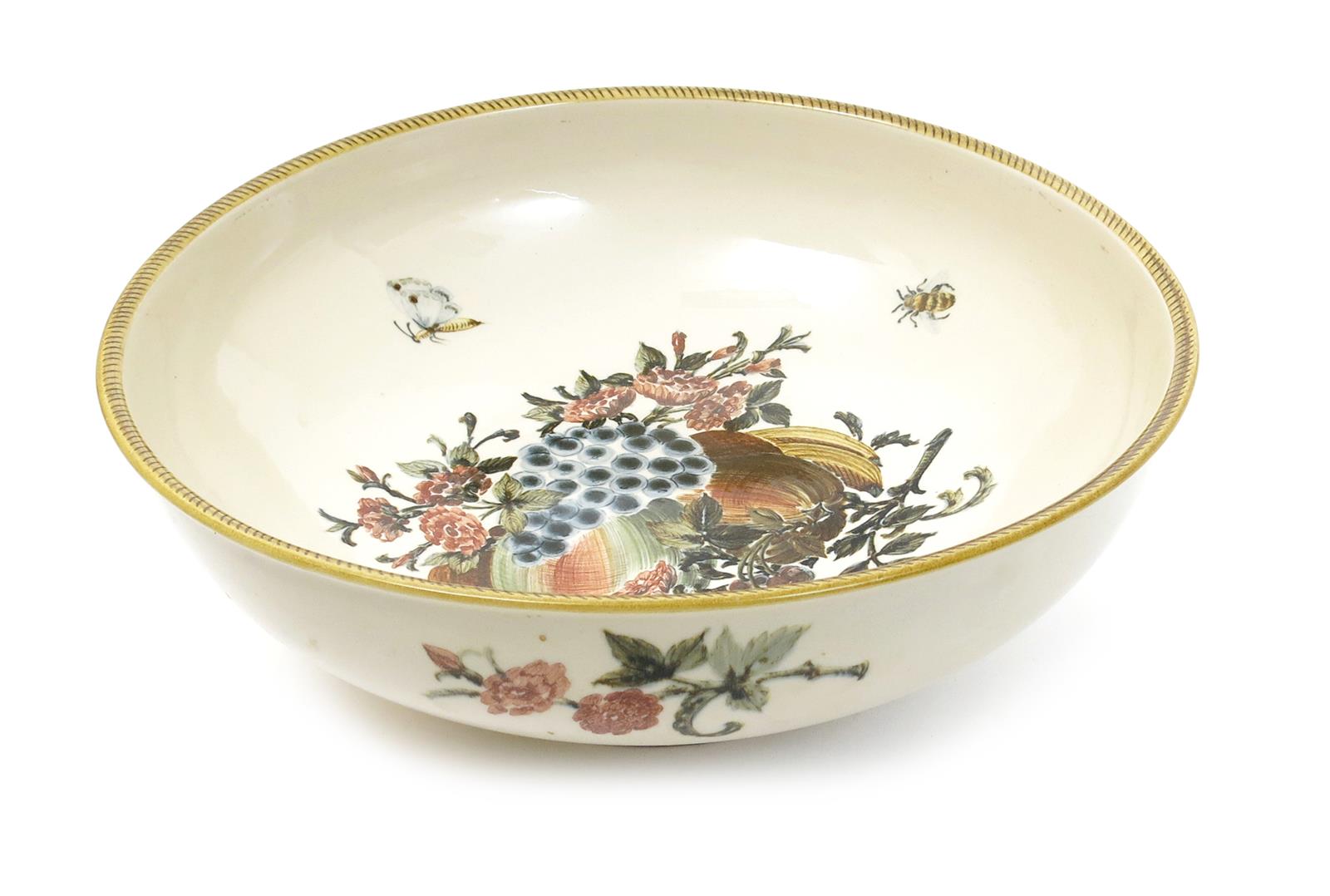 A large Doulton Lambeth stoneware bowl by Agnette Hoy, footed form with rope-twist border, painted to the well with autumnal fruit and foliage flanked with butterflies and bees in colours with Bristol glaze impressed marks and incised signature, 34cm. wide.