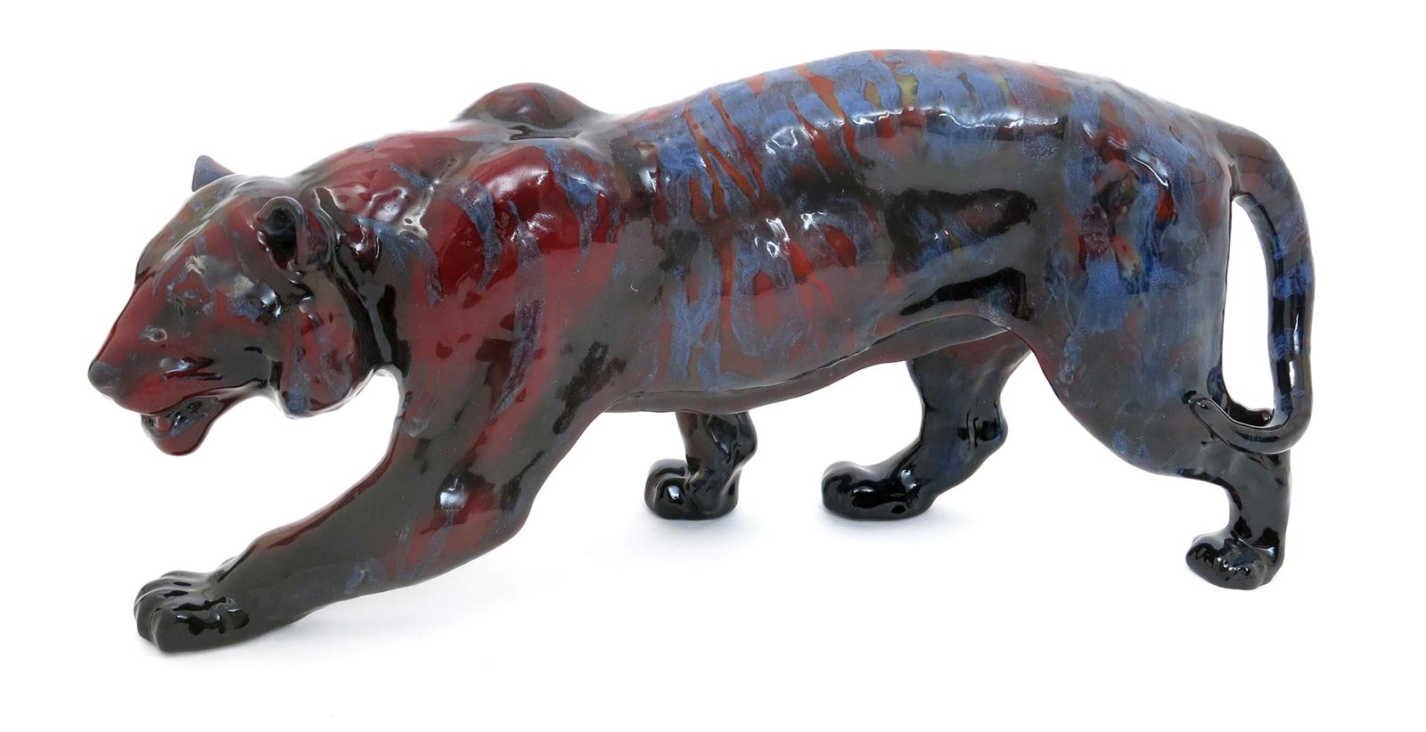 Tiger Stalking HN.1082 Royal Doulton Flambe model of a tiger designed by Charles Noke, modelled walking, glazed flambe red with lavender blue stripes, 35cm. wide