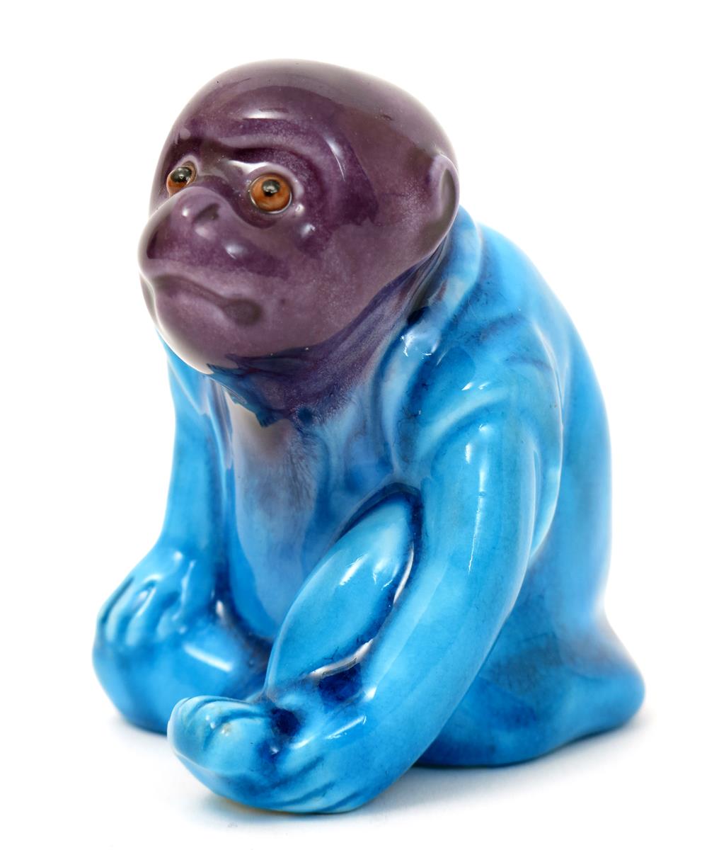 A Bernard Moore porcelain model of a seated monkey, glazed in a rare purple and turquoise colour way, with applied glass eyes printed BM monogram 9cm. high