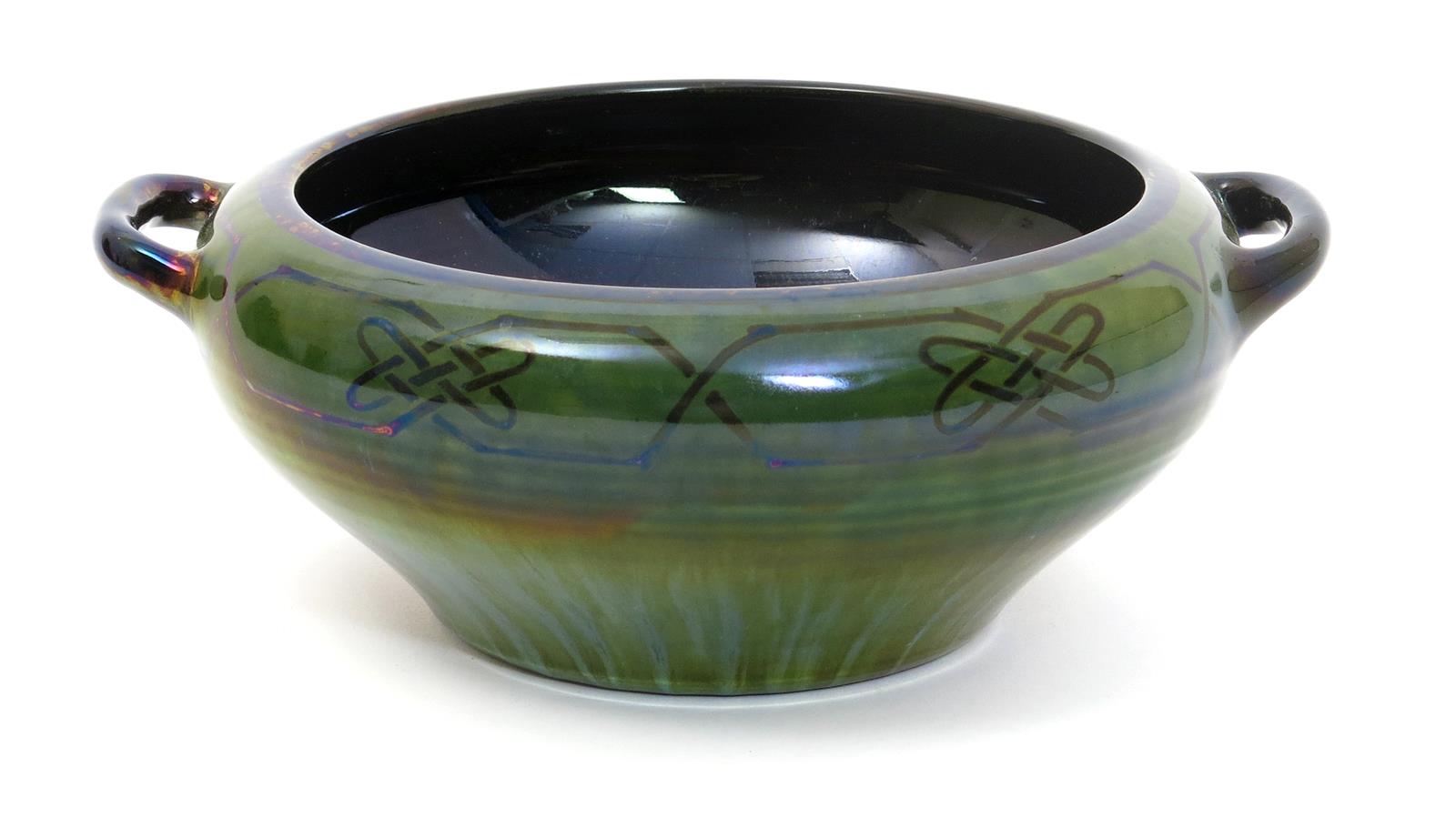 A Pilkington's Lancastrian twin-handled bowl by Gladys Rogers, painted with a simple Celtic knot border in bronze on a streaked green ground, impressed marks, painted artist cipher, 26cm. wide.