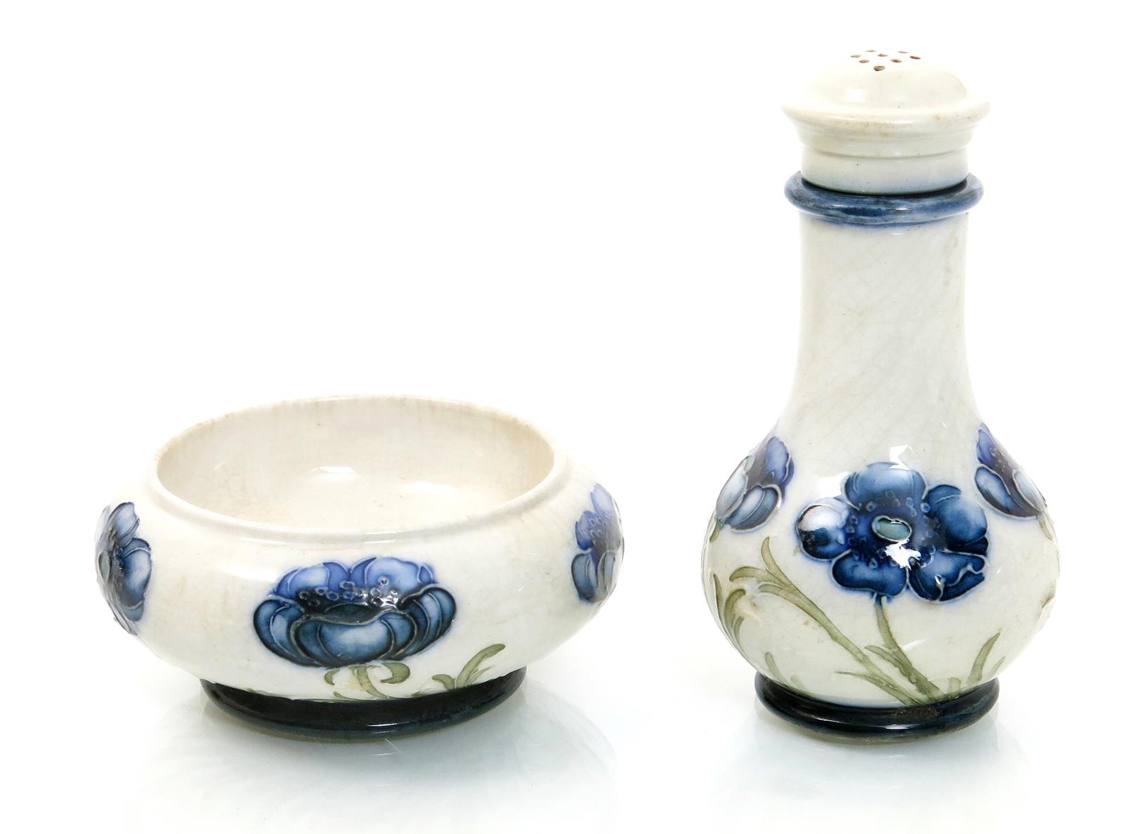 'Poppy' a James Macintyre & Co salt and pepper cruet designed by William Moorcroft, painted in blue and green on a white ground, printed factory marks, restoration to cover, 9cm. high