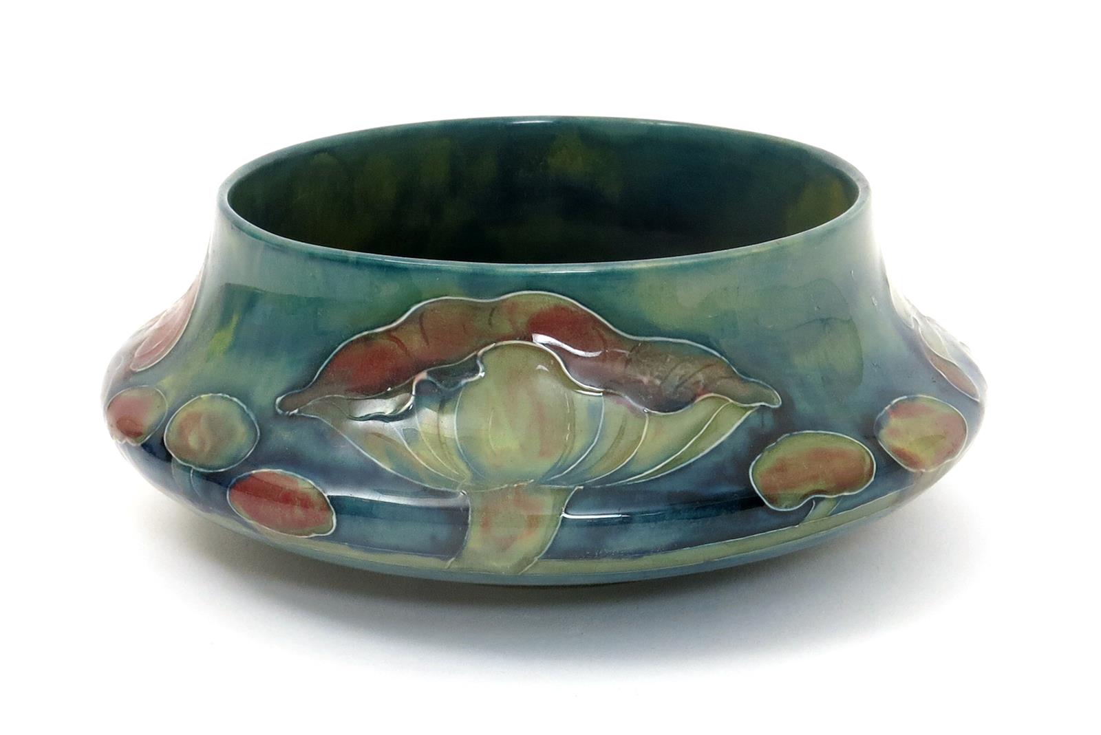 'Claremont' a Moorcroft Pottery vase designed by William Moorcroft, made for Liberty & Co, low, compressed form, painted in shades of red, cream and purple on a streaked green ground, printed Liberty mark, painted green signature,16cm. diam.