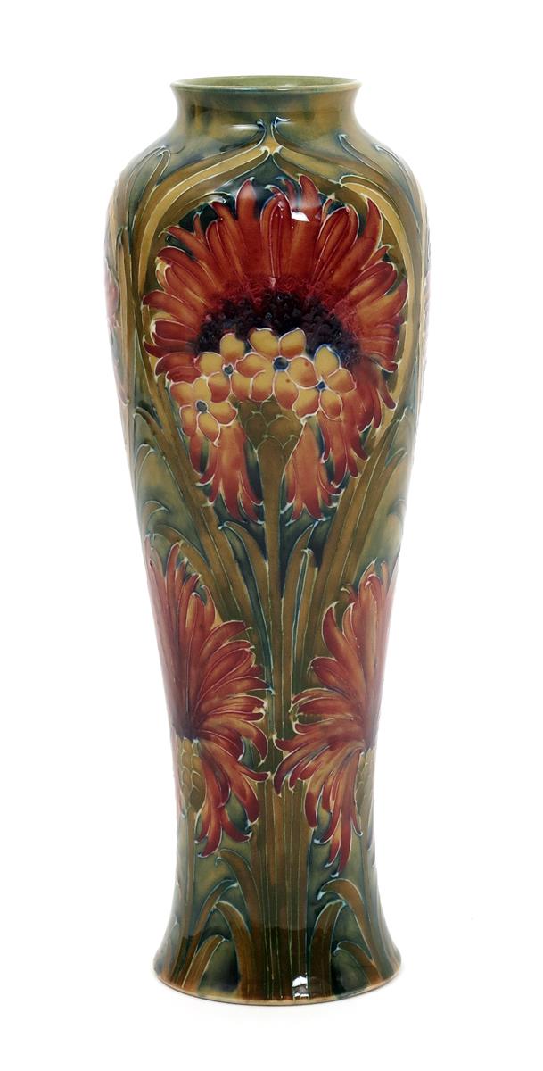 'Revived Cornflower' a tall James Macintyre vase designed by William Moorcroft, dated 1912, slender, baluster form, painted in shades of pink, purple, and ochre on a green ground with chrysanthemum flowers, printed factory mark, painted green signature and date, professional restoration to outside of top rim, 30cm. high