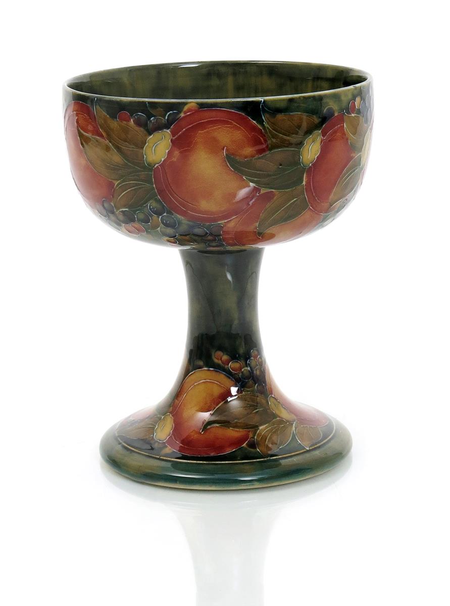 'Pomegranate' a Moorcroft Pottery coupe designed by William Moorcroft, painted in shades of pink, purple, ochre and red on a mottled green ground, impressed marks, painted green signature, printed Liberty mark, 20cm. high