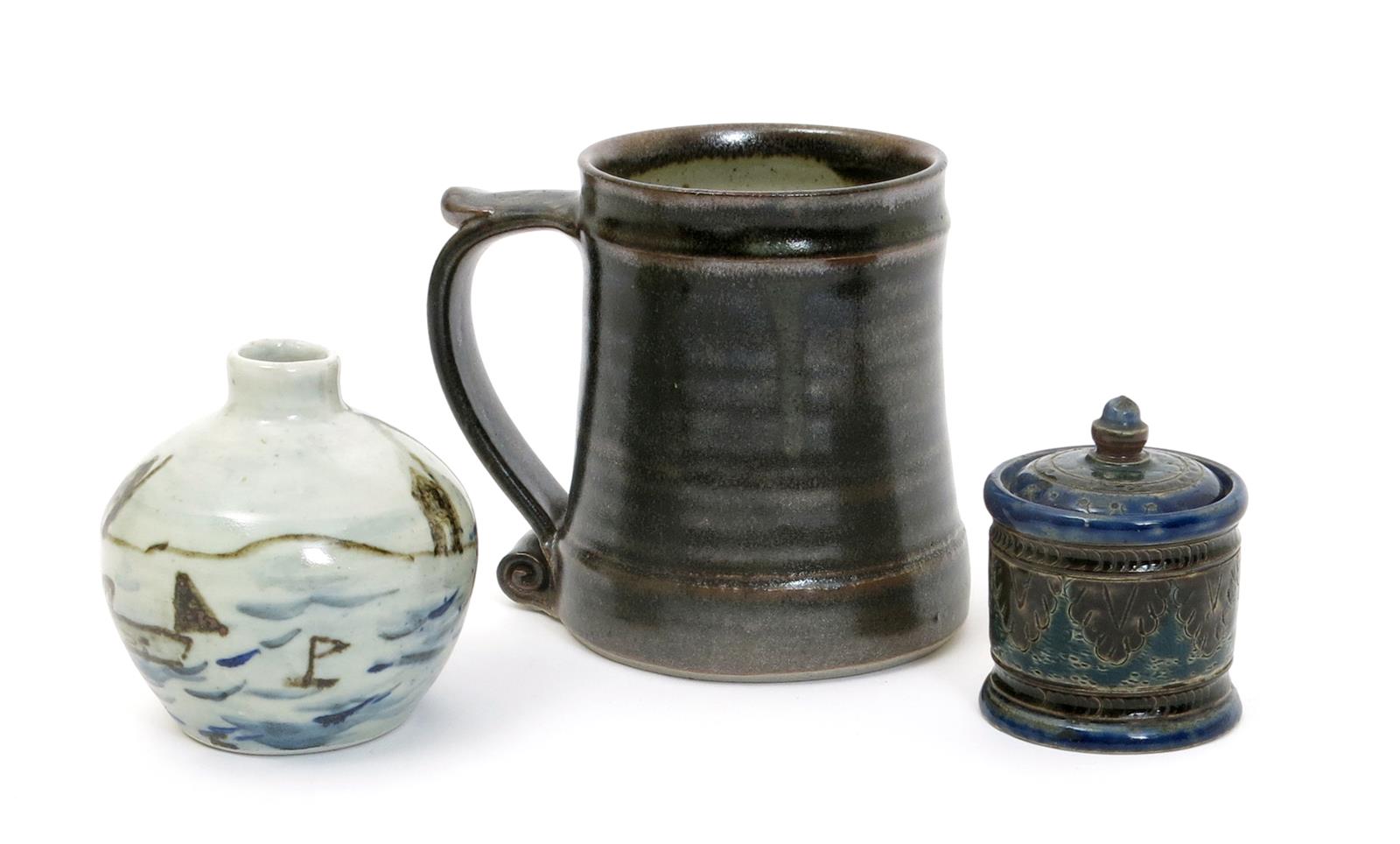 a stoneware mug, with applied scroll handle, covered in a tenmoku glaze, a Leach Pottery vase by Trevor Corser painted with a harbour scene and a small Fulham Pottery pot and cover in the manner of Edgar Kettle, impressed seal mark to base, 12cm. high, (4)