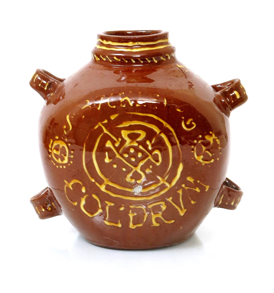 A Coldrum Pottery vase dated 1909, with applied strap handles, slip decorated with a central face motif, date and inscribed Flowers, the reverse with knot motif and Buckley Coldrum, (minor glaze chips, kiln faults, 26.5cm. high