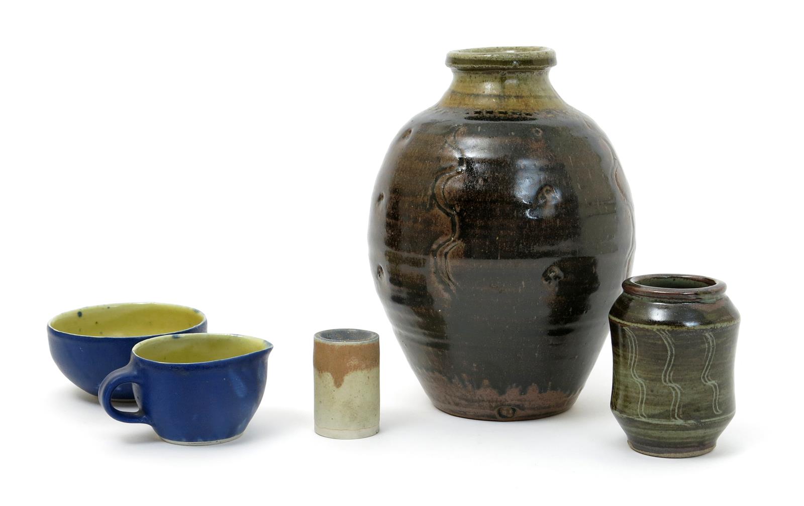 a shouldered stoneware vase, incised with trail columns and impressed dots, covered in a tenmoku glaze over ash, a small David Leach Lowerdown Pottery vase a Ruth Duckworth milk-jug and sugar basin and a small solifleur vase impressed seal mark, 24.5cm. high, (5)