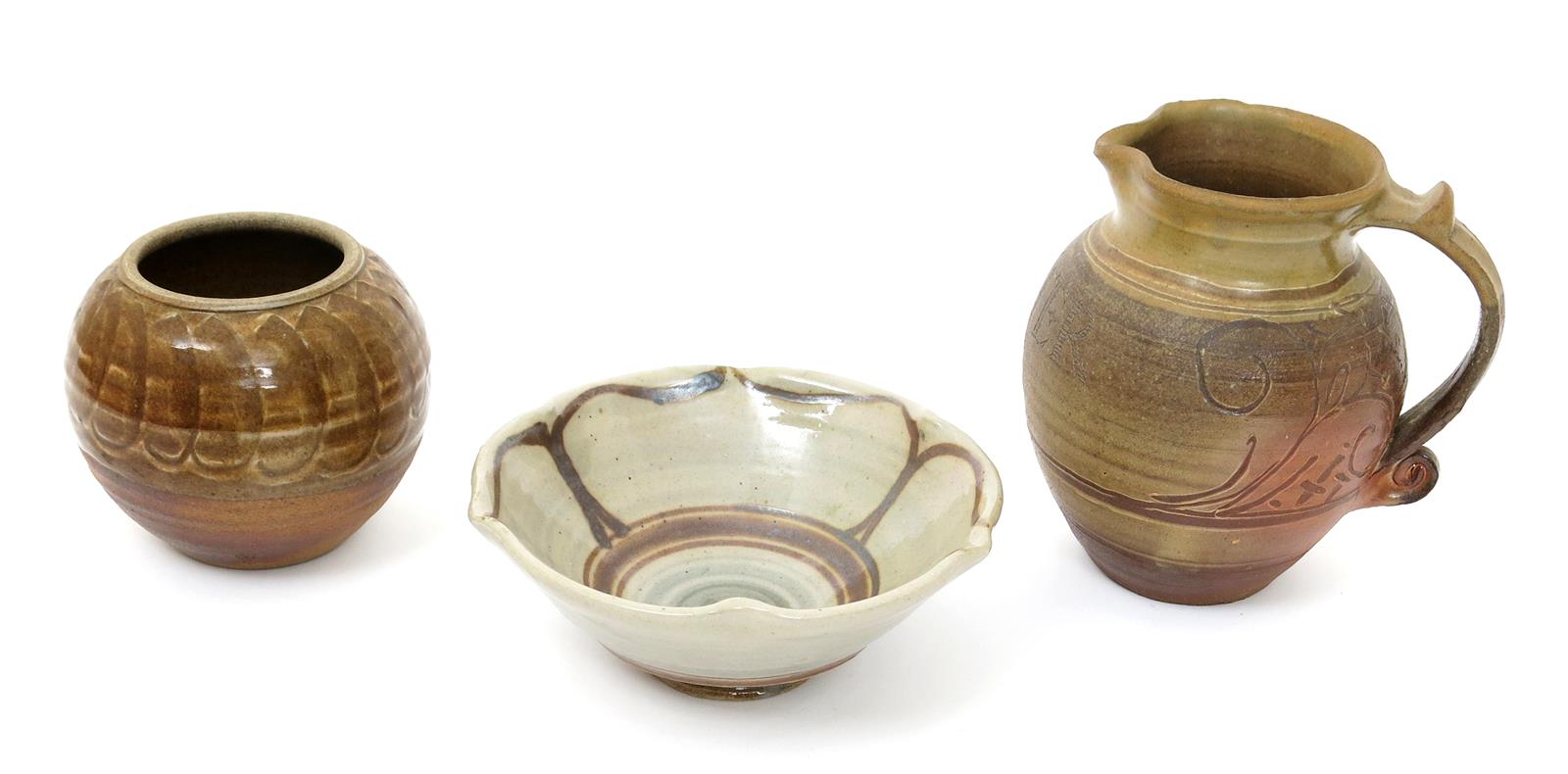 a Wenford Bridge water jug, incised with simple floral design and Water, a flower bowl by Seth Cardew and a stoneware vase with cut decoration by Svend Beyer, glazed to the shoulder with a wood-ash glaze, impressed seal marks, 15cm. high (3)