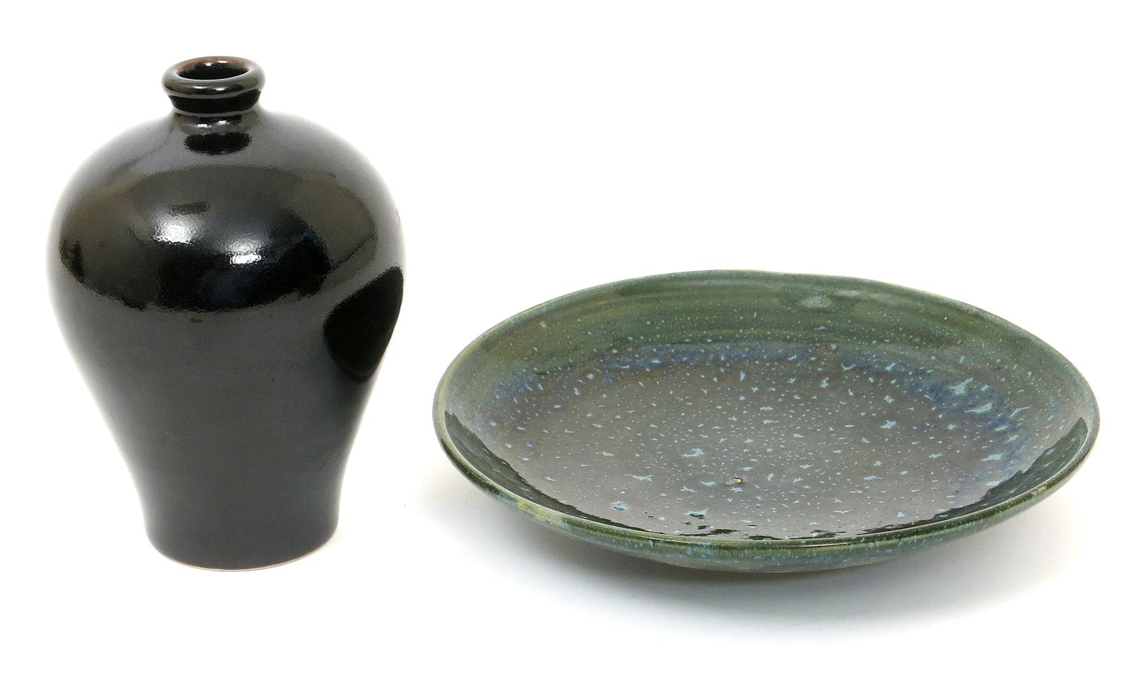 a porcelain bottle vase, swollen form, covered to the foot in a rich, dark tenmoku glaze, and a plate by Poh Chap Yeap covered in a deep green glaze with turquoise splashes, incised Yeap, fine hairline to plate, vase 14cm. high (2)