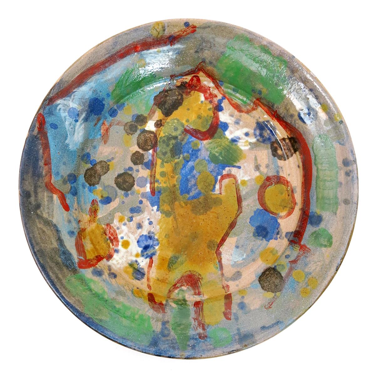 ‡ A Fulham Pottery plate by Quentin Bell, paintyed with an abstract figure in red and amber on a multicoloured painted ground, impressed Fulham pottery mark and impressed Bell roundel, 24.5cm diam.