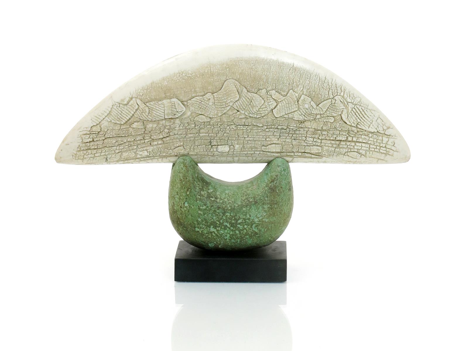 Mounted blade, 2007, a white raku sculpture on verdi gris pottery base mounted on black slate base, incised Peter Hayes 07 to base, 43cm. wide