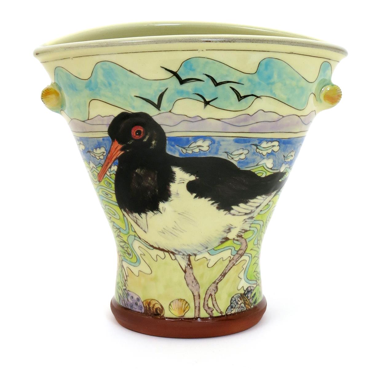 Oystercatcher and Lapwing, a flattened, flaring vase, painted in colours and modelled with shell lugs, impressed seal mark to base, 20cm. high
