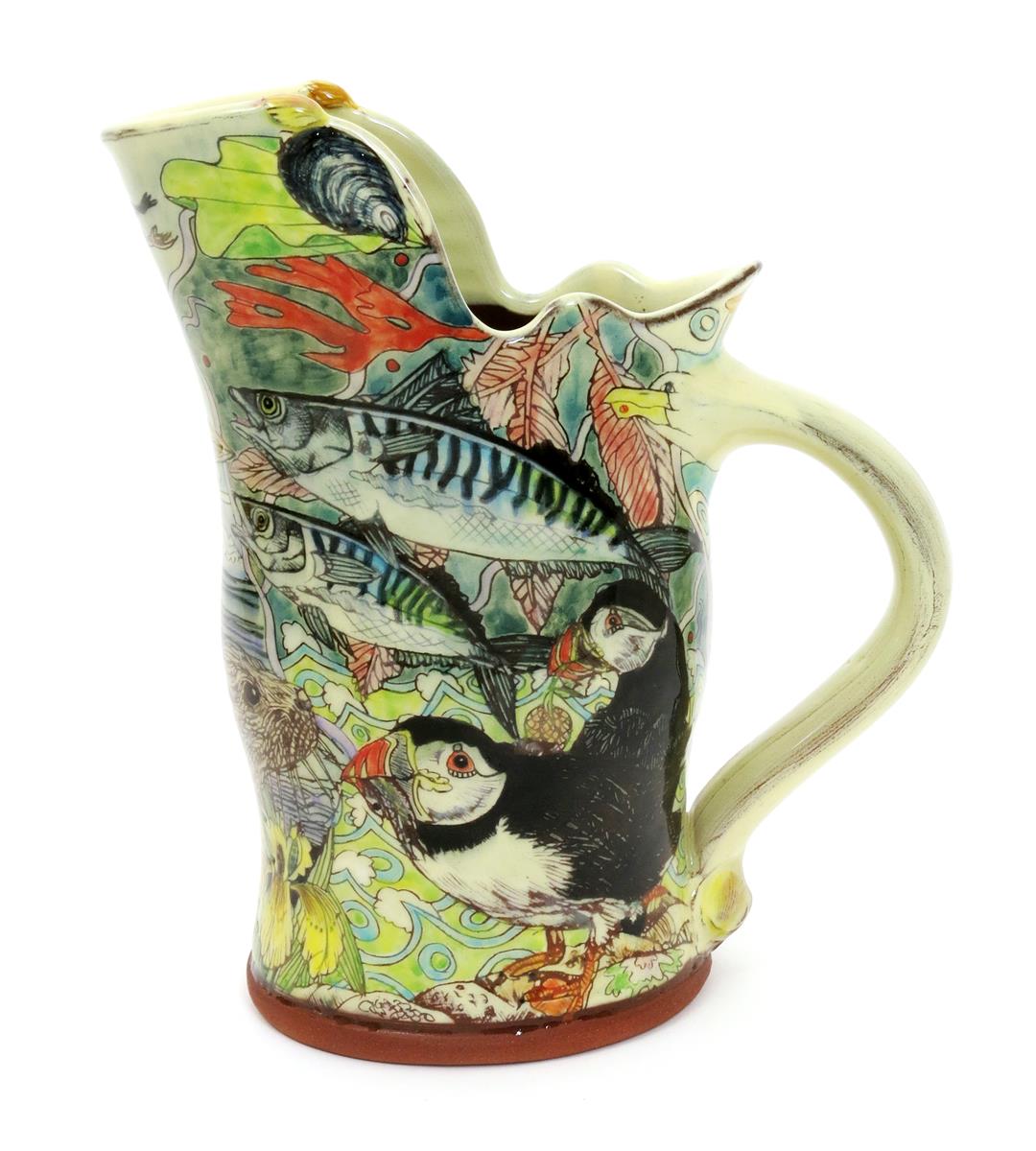 Otter, Puffins and Grey Heron a jug, painted in colours impressed seal mark, 23.5cm. high