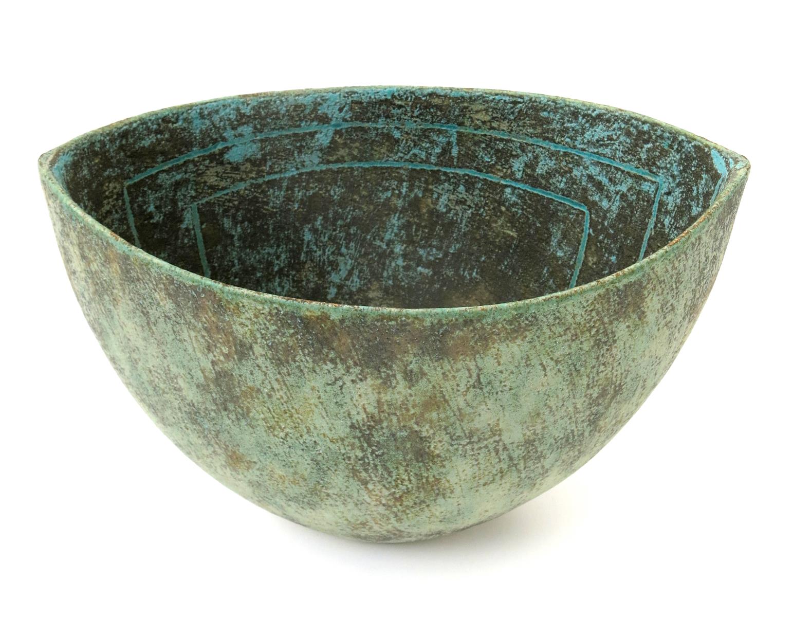 an unusual hand-built vase, tapering, elliptical section, with incised decoration to interior, glazed turquoise over brown, impressed seal mark to base, 28.5cm. wide.