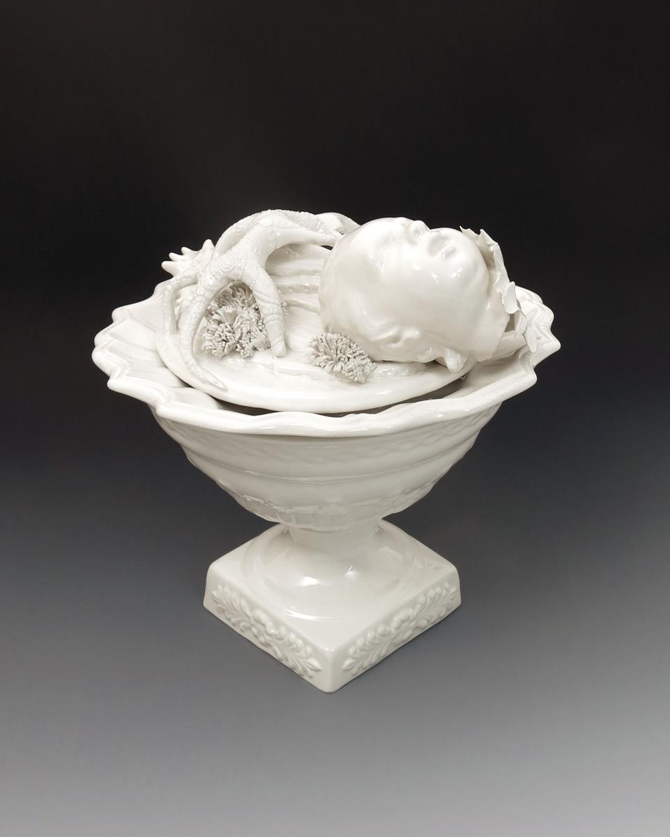 Baroque Rain a unique surrealist vase and cover with applied decoration of creatures, crab shell and a child's head to the cover, glazed white incised Renzi & Reale, 2005 to the rim, base printed made in Italy, 25.5cm. high (2)