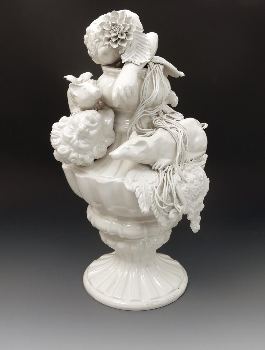 Baroque Rain, a unique surrealist urn vase, the fluted body applied with two classical heads and an arm and two rats, glazed white incised Renzi e Reale 2004, Milano to the base rim, 46cm. high