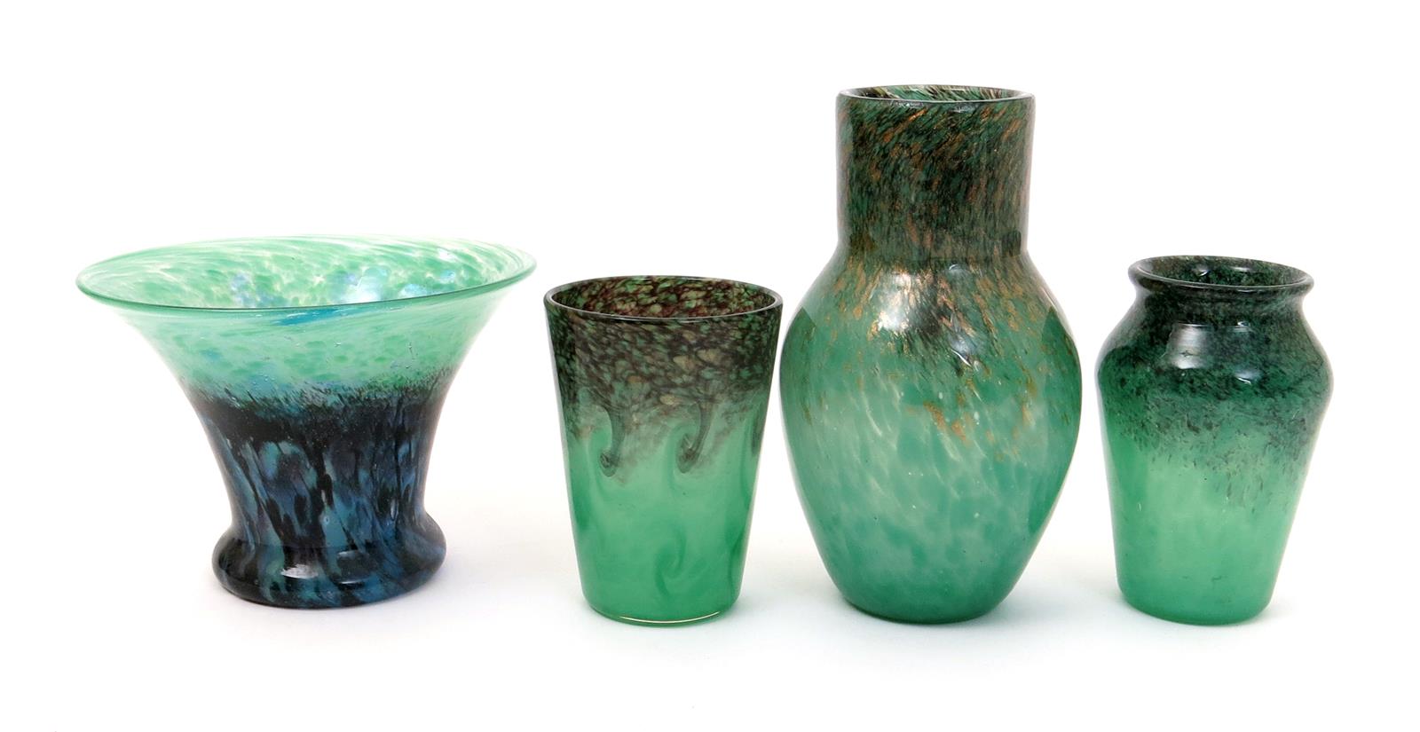 A Monart glass vase, model GC-336, flaring form mottled green graduating to purple at the foot, and four other Monart glass vases, applied paper label, 14cm. high (5)
