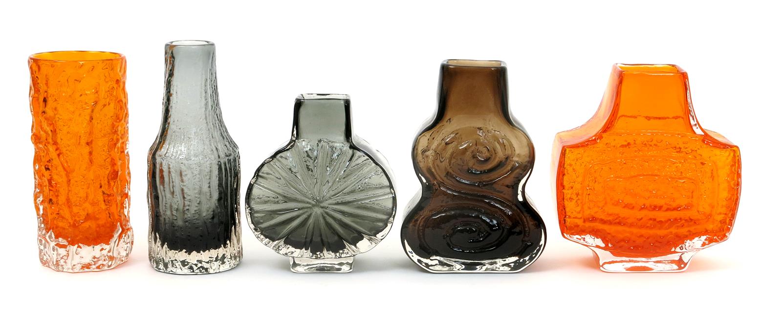 A Whitefriars Tangerine glass vase designed by Geoffrey Baxter, the rectangular body cast in relief with bark texture, a Whitefriars Cinnamon glass Cello vase, and three other Whitefriars glass vases designed by Geoffrey Baxter unsigned, 16cm. high, (5)