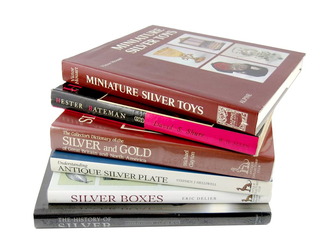 including: Shure, D., Hester Bateman, Houart, V., Miniature Silver Toys, The Courtauld Silver, George Wickes, Paul De Lamerie, The Collector's Dictionary of Silver and Gold, Silver Boxes, Understanding Antique Silver Plate and other volumes. (qty) (Two Boxes).