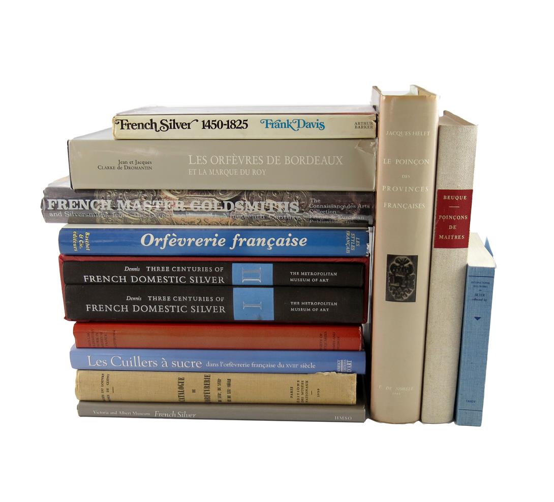 including: Three centuries of French Domestic Silver, Vol. I and II, Les Orfevres de Bordeaux, Le Poincon des Provinces Francaises, French Master Goldsmiths, Les Cuillers a Sucre, and other publications. (qty)