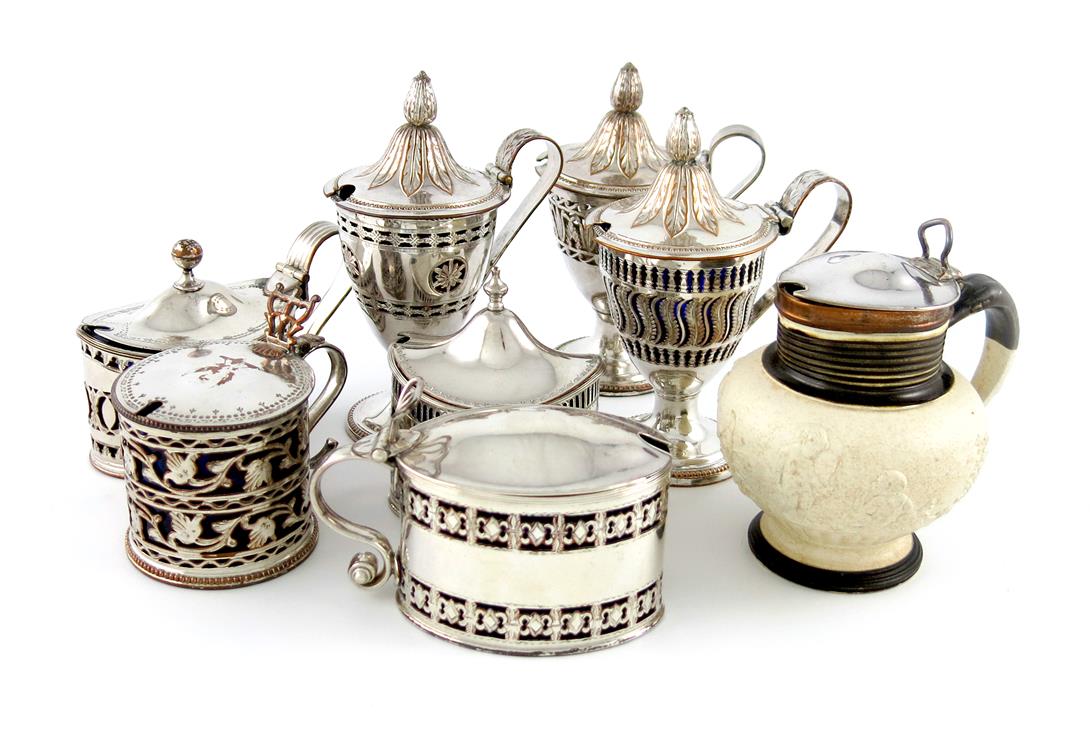 various designs, pierced decoration, six with blue glass liners, plus an old Sheffield plated mounted jug. (8)