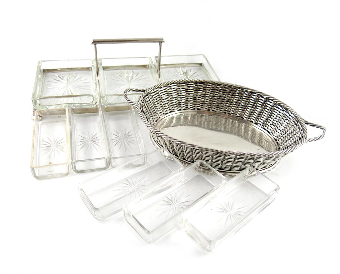 oval form, simulated wicker-work body, length 34cm, plus a rectangular serving dish, by Elkington, with a central handle, on four bun feet, fitted with two sizes of glass dishes with three or six segments, some damage to glass, length 37.5cm.