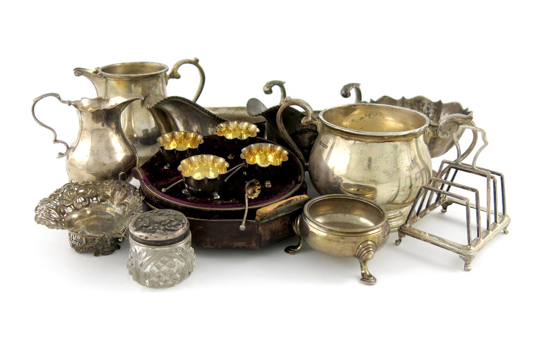 comprising: a George III cream jug, of baluster form, London 1763, a cream jug and sugar bowl, Sheffield 1925, a pair of sauce boats, a toast rack, a salt cellar, a small bowl, a bonbon dish, a toilet jar, and a cased set of four salt cellars, approx. weight 37oz. (qty)