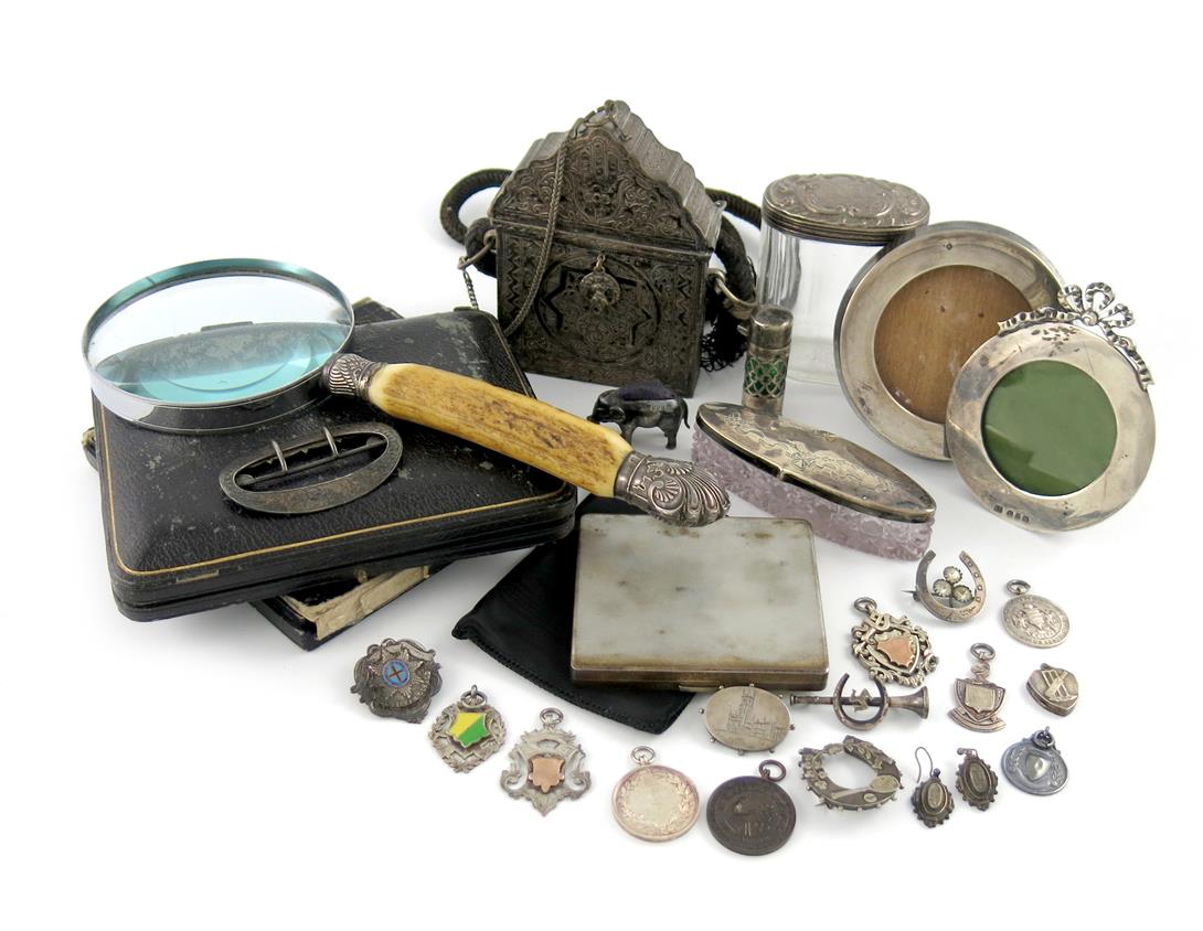 comprising: an Edwardian novelty elephant pin cushion, by Allday and Lovekin, Birmingham 1906, a Dunhill cigarette case, with engine-turned decoration, Birmingham 1956, inscribed, in original wrapping in a box, a middle Eastern box, with a hinged cover and cord attachment, various badges and medallions including one engraved with Cirencester Church and one with a tennis racquet, two photograph frames, two dressing table pots, a scent bottle, two cased set of spoons, and a magnifying glass with a stag antler handle with silver mounts, approx. weighable 14oz. (qty)