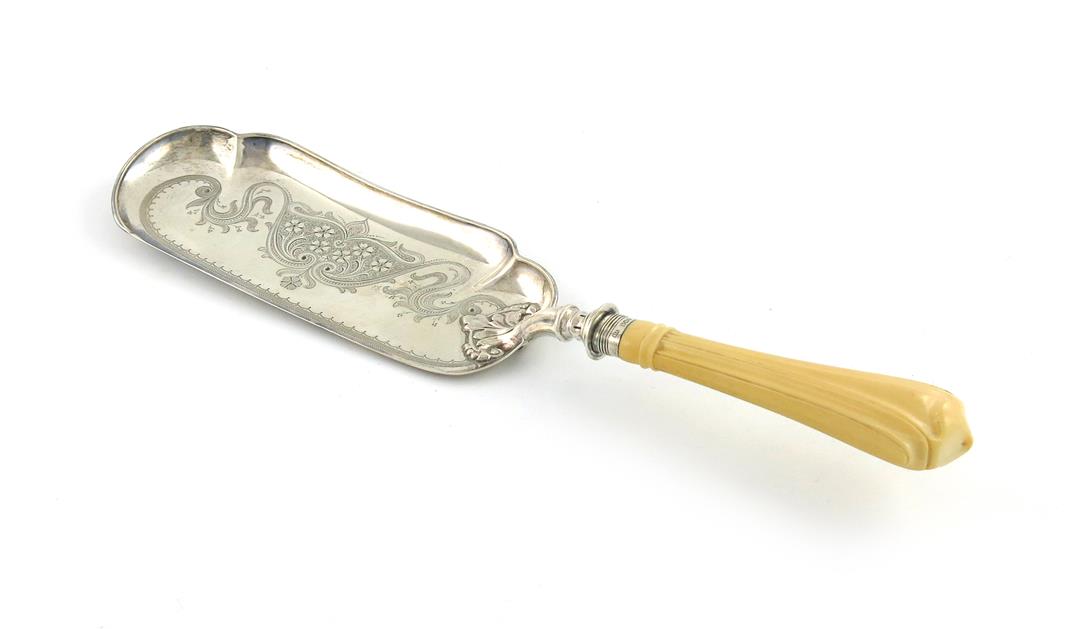 the shaped blade with engraved decoration, carved ivory handle, length 34.5cm.