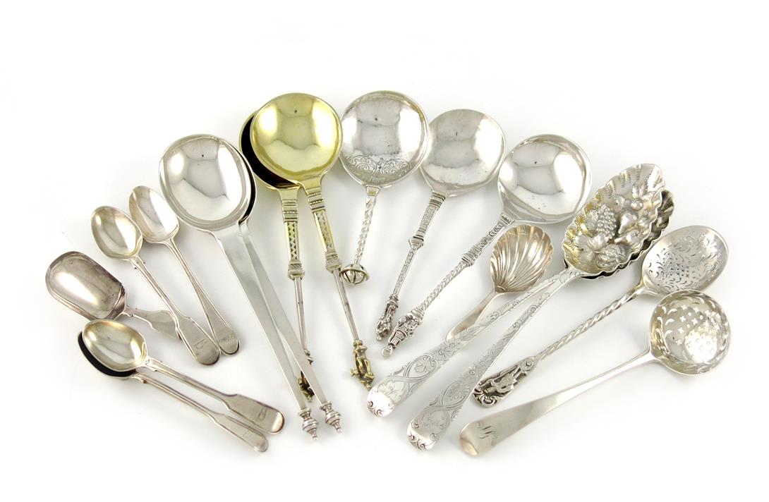 comprising: two sifting spoons, one by George Adams, London 1851, two caddy spoons, London 1788 and 1813, a pair of berry spoons, three egg spoons, a teaspoon, a pair of tapering spoons, plus four continental spoons, approx. weighable 20oz. (qty)