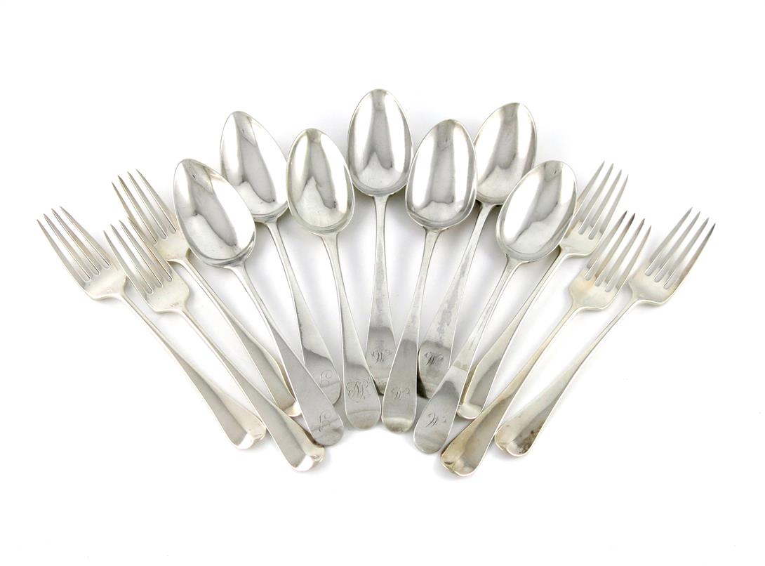 comprising: a set of six Old English pattern table forks, by Ann Robertson, Newcastle 1802, the reverse of the terminals with a crest, plus seven various tablespoons, approx. weight 22.5oz. (13)