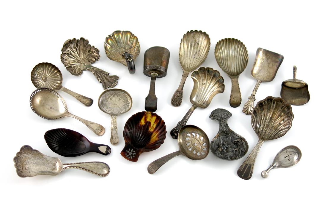 comprising: a George III one with a pierced oval bowl, by Joseph Taylor, Birmingham 1796, one by Peter and Ann Bateman, London 1793, an Irish Fiddle pattern one, one of leaf form, one with a shovel bowl, plus nine others, and two tortoiseshell caddy spoons, an old Sheffield plated caddy spoon and an electroplated example, approx. weighable 4.4oz. (qty)